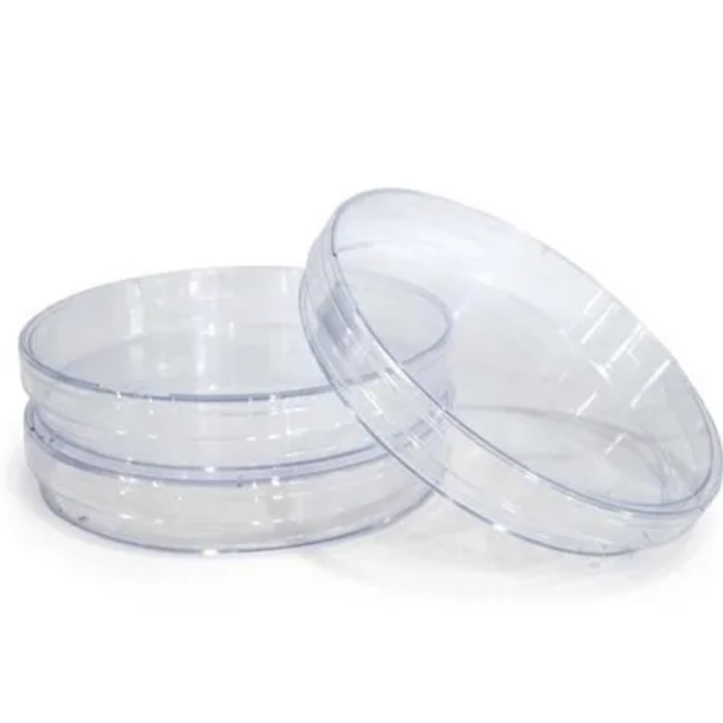 Placas de Petri descartáveis em poliestireno (PS) virgem e atóxico, totalmente transparentes e com fundo plano, ideais para procedimentos de microbiologia e bacteriologia.