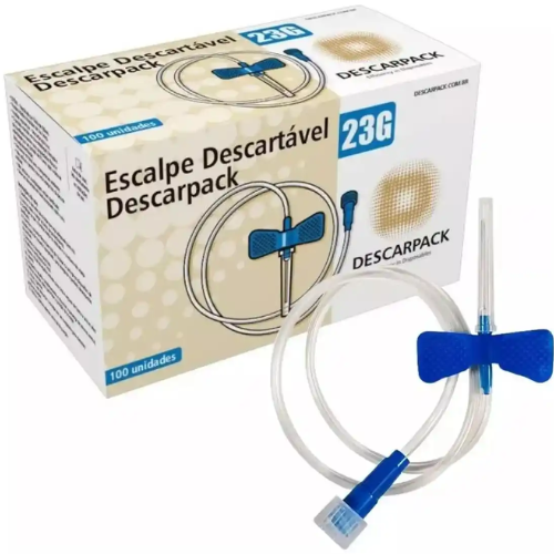 Scalp (agulha tipo borboleta) convencional para infusões intravenosas de curta duração. Desenvolvido pela Descarpack com sistema de segurança que reduz o risco de perfurações acidentais, oferecendo mais proteção ao paciente e ao profissional.