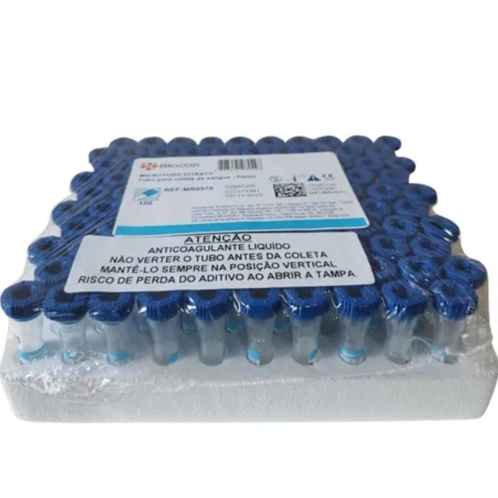 Microtubo a vácuo confeccionado em plástico transparente de alta qualidade, com tampa azul, contendo citrato de sódio como anticoagulante. Indicado para exames de coagulação em pequenas amostras de sangue, com volume reduzido de coleta.