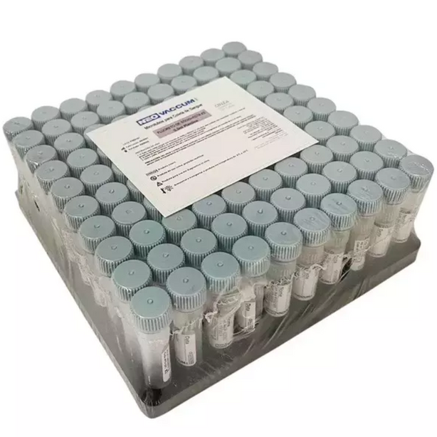 Microtubo a vácuo em plástico transparente, com tampa cinza, contendo fluoreto de sódio como aditivo. Indicado para exames de glicemia em situações onde se requer coleta de microvolumes de sangue.