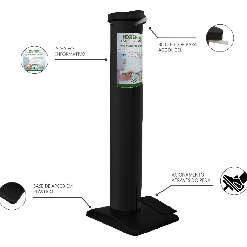 Pedestal dispenser em tubo metálico com acionamento por pedal, ideal para higienização das mãos sem contato manual. Desenvolvido para uso em ambientes de grande circulação, como clínicas, laboratórios, indústrias, escritórios, escolas e estabelecimentos comerciais.