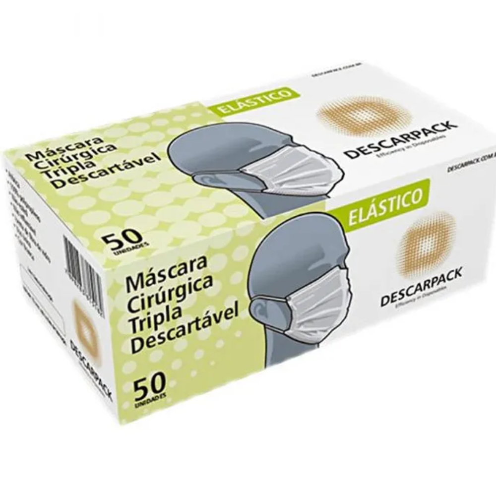 Caixa com 50 unidades de máscara cirúrgica tripla com elástico, oferecendo proteção, conforto e praticidade para uso diário em ambientes clínicos e hospitalares.