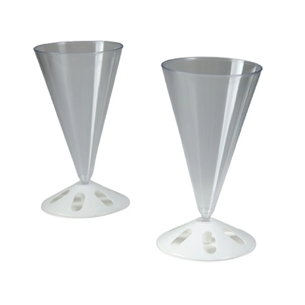 Taça em formato de cálice confeccionada em PS cristal transparente, utilizada em procedimentos laboratoriais de sedimentação e análises parasitológicas.
