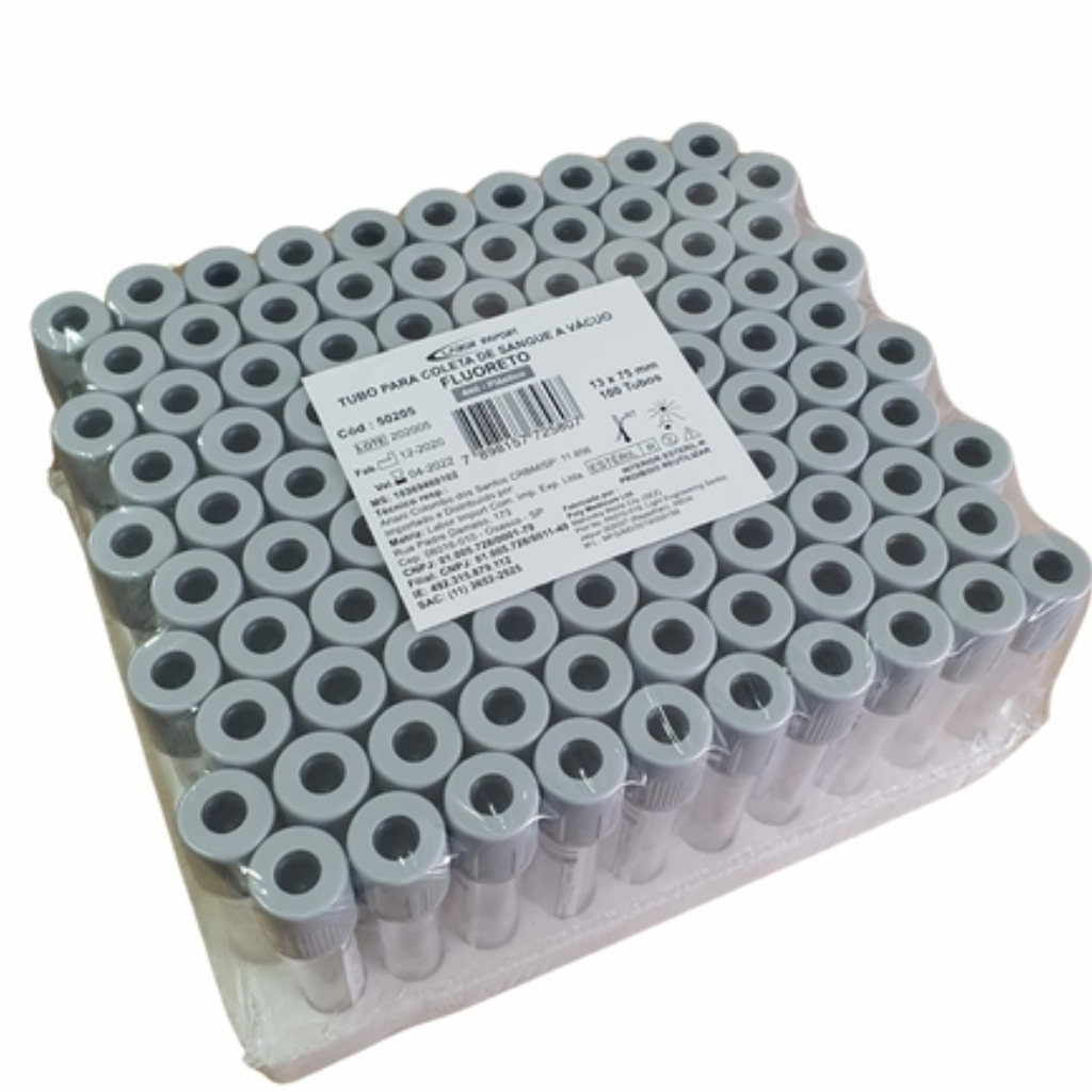 Tubo a vácuo em plástico (PET), capacidade de 4 mL, contendo fluoreto de sódio e oxalato de potássio.