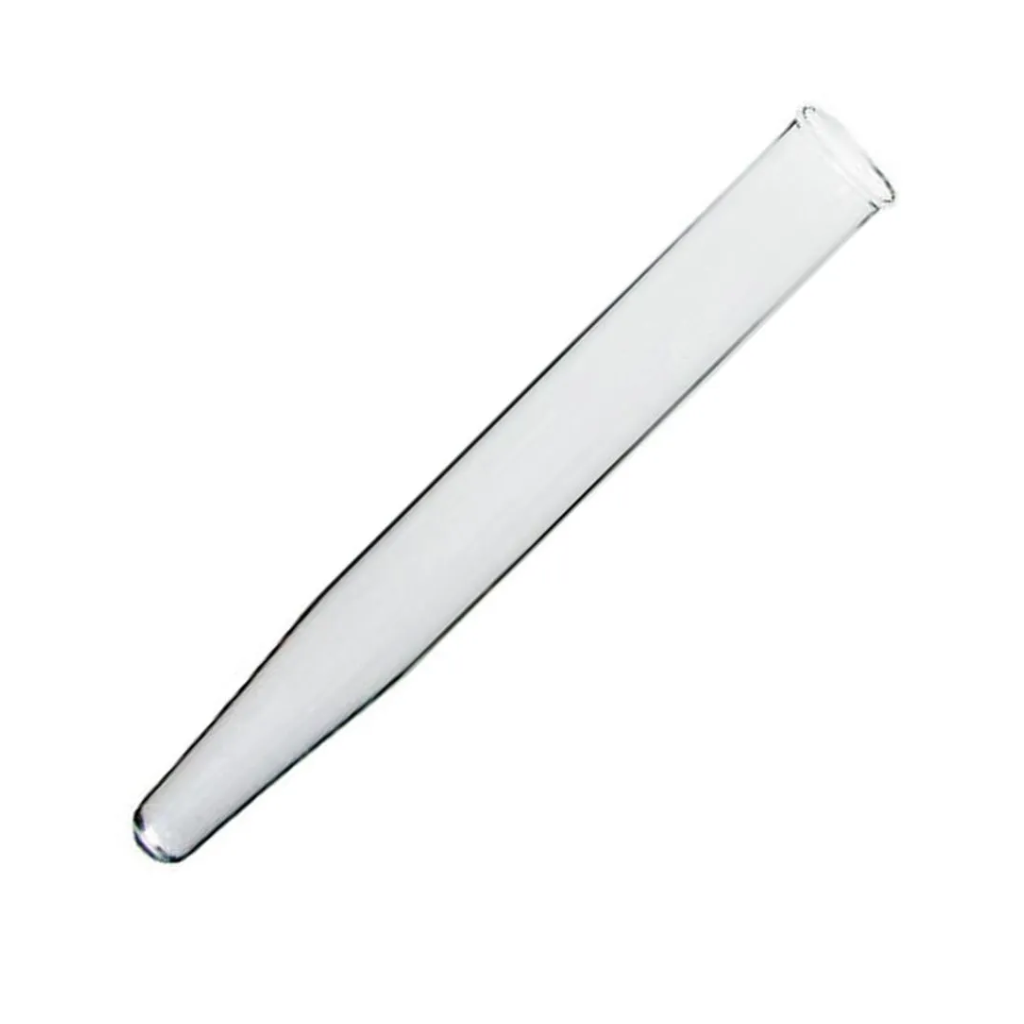 Tubo de centrífuga em vidro borossilicato 3.3, capacidade aproximada de 15 mL, com fundo cônico, borda reforçada e graduação externa.