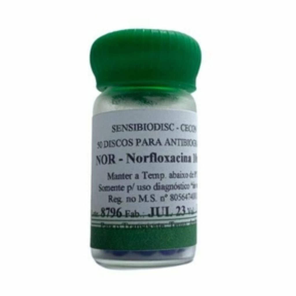 Discos impregnados com Norfloxacina 10 µg, indicados para uso em testes de sensibilidade a antimicrobianos (antibiograma) pelo método de difusão em ágar (Kirby-Bauer/BrCAST). Amplamente utilizados em laboratórios de microbiologia clínica para avaliação da eficácia de antibióticos frente a microrganismos patogênicos.
