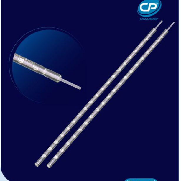 Pipeta de vidro graduada com sistema de aspiração Takives, indicada para a execução do exame de Velocidade de Hemossedimentação Sanguínea (VHS) conforme método Westergren.