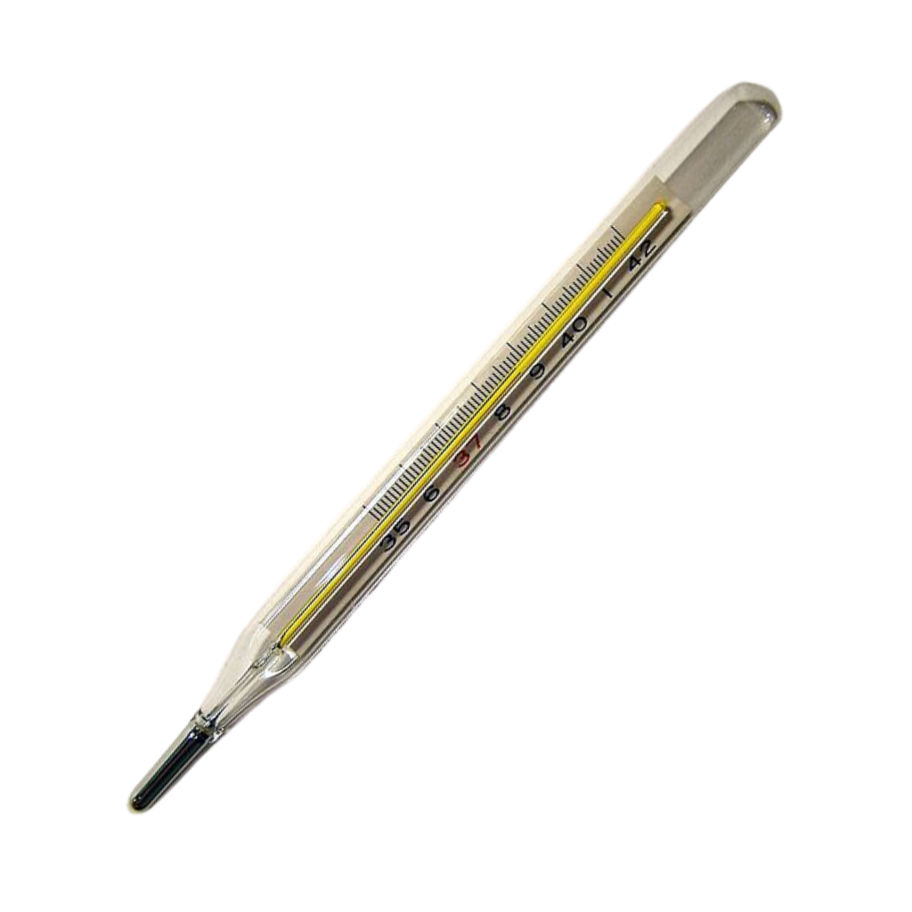 Termômetro químico de vidro com enchimento em líquido vermelho, indicado para medições gerais em laboratórios e processos industriais.