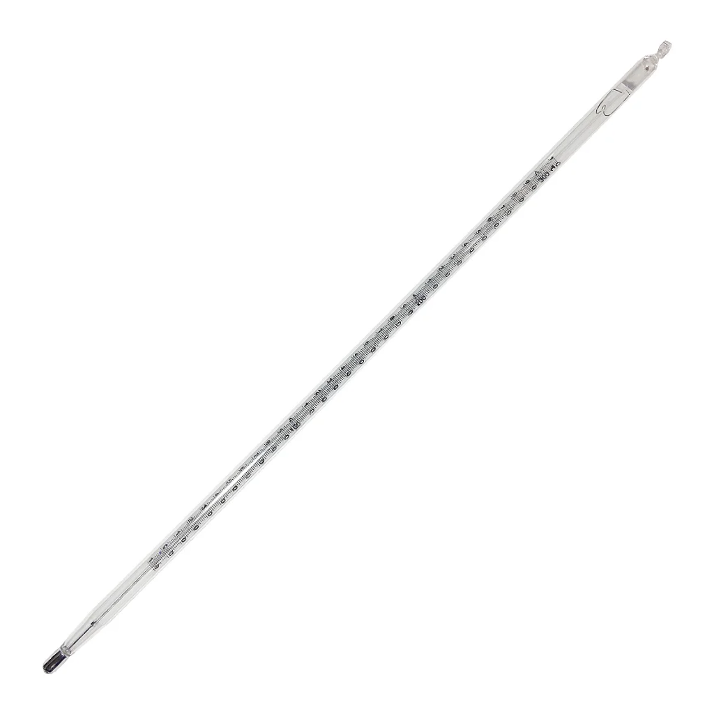 Termômetro químico em vidro com enchimento em mercúrio (Hg), ideal para medições de alta temperatura em laboratórios e indústrias.