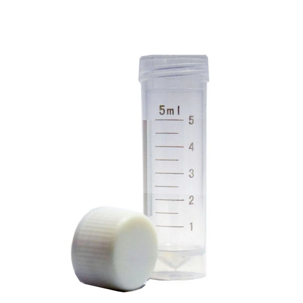 Tubo para congelamento com rosca externa e capacidade total de 5 mL, graduado para medição precisa.
